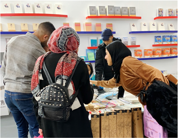 中國展區(qū)是本屆書展中面積最大的展區(qū)之一。此次書展,人民天舟為當(dāng)?shù)刈x者準(zhǔn)備了一百余種、六千余冊阿語、法語、英語精品圖書,重點(diǎn)展出了新近出版的《平“語”近人——習(xí)近平總書記用典》阿語版等主題圖書;同時(shí)還根據(jù)當(dāng)?shù)厣賰鹤x者的需要,展出了《我要飛》(阿語版)、《米莉茉莉和莉莉成長故事》系列(英語版)、科普繪本《漫畫十萬個(gè)為什么》系列(法語版)等一大批優(yōu)秀少兒圖書,以及反映中國傳統(tǒng)文化的《我心中的少林》(英語版)、《少林功夫》(英語版)等書籍、具有中國特色的文創(chuàng)產(chǎn)品等。中國展臺很受讀者喜愛,每天都有眾多讀者在展臺翻閱與購買相關(guān)圖書。
