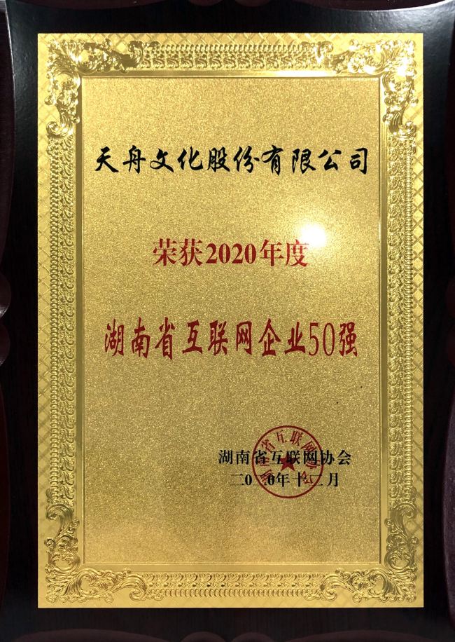 喜訊 | 天舟文化榮獲“2020年度湖南省互聯(lián)網(wǎng)企業(yè)50強”稱號