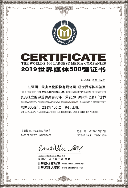 12月17日,由世界媒體實(shí)驗(yàn)室(World Media Lab)獨(dú)家編制的2019年度(第七屆)《世界媒體500強(qiáng)》排行榜在美國(guó)紐約揭曉,天舟文化憑借出色的營(yíng)收數(shù)據(jù)、優(yōu)異的品牌影響力及國(guó)際化的業(yè)務(wù)布局,連續(xù)第6年入選“世界媒體500強(qiáng)”榜,排名躍居第406名。