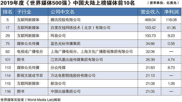 據(jù)悉,此次評(píng)選共有來(lái)自美洲、歐洲和亞洲40多個(gè)國(guó)家和地區(qū)的3000多家媒體公司參與,涉及電視/廣播電臺(tái)、報(bào)紙、圖書(shū)、期刊、互聯(lián)網(wǎng)新媒體、有線寬頻或衛(wèi)星、綜合媒體、影視文娛/節(jié)目及媒體公關(guān)傳播等9個(gè)子行業(yè)。來(lái)自美國(guó)的谷歌(Google)、康卡斯特(Comcast)、迪斯尼公司(Walt Disney)憑借年?duì)I業(yè)收入位居榜單前三甲。中國(guó)(含港澳臺(tái))今年共有95家媒體公司入選,僅次于美國(guó)位居第二,平均營(yíng)業(yè)收入13.84億美元,再次超越日本成為亞洲第一媒體大國(guó)。騰訊、百度、網(wǎng)易為中國(guó)大陸上榜媒體前三甲,分別位居第5名、第11名及第29名。
